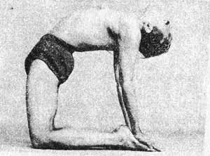 “Лёжа лицом вниз, раздвинь ноги и положи их на спину; держи ступни руками. Подтяни живот и сильно втяни рот. Эту позу аскеты называют Уштрасана.” Вот как она выглядит: