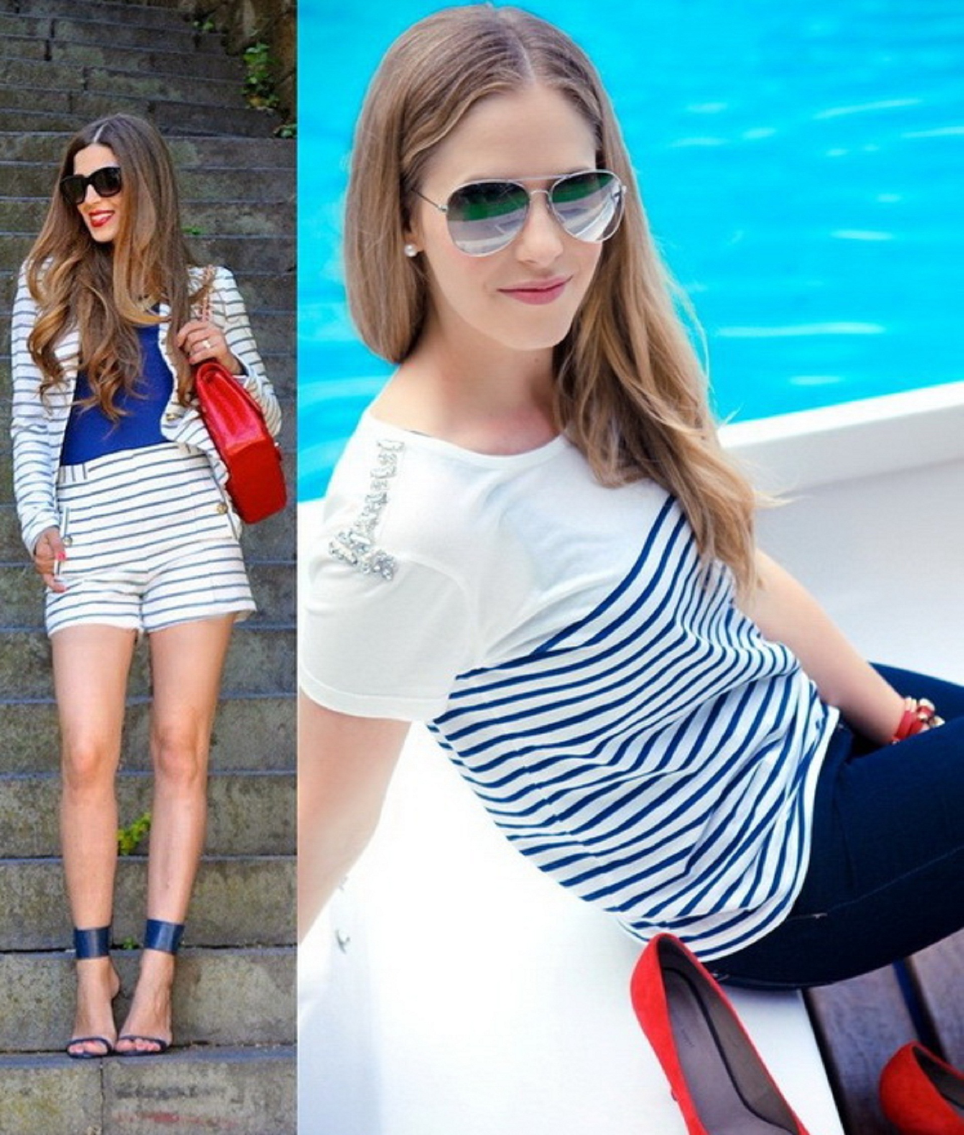 Самый распространенный рисунок морского стиля – горизонтальная полоска, а обязательная вещь – тельняшка. Сейчас достаточно просто найти майку, футболку, блузку или пиджак с таким принтом, они настолько вошли в повседневный обиход, что есть практически в каждом магазине. Такой верх можно сочетать с юбкой или брюками красного цвета, или другими его оттенками, что позволит всегда выглядеть актуально и свежо. Хорошо морской стиль в одежде смотрится с джинсами, так можно сочетать морской верх с джинсами, или использовать джинсовую куртку с платьем в морском стиле.